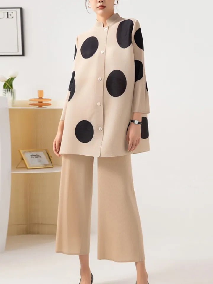 A relaxed yet elegant pleated set designed for style and ease. The long sleeve top pairs with high-waisted wide-leg trousers, both made from soft, breathable fabric.