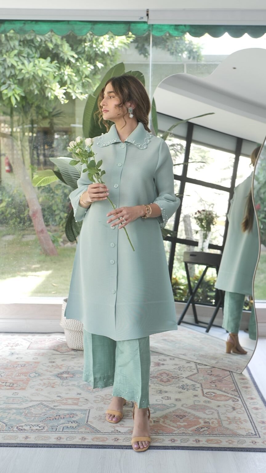 A chic pearl-studded collar top, crafted from premium pleated rayon and adorned with intricate embellishments, perfect for adding a touch of sophistication to your wardrobe. Pair it with our raw silk pants, available for purchase separately, to complete an effortlessly elegant look suitable for both casual and semi-formal occasions.