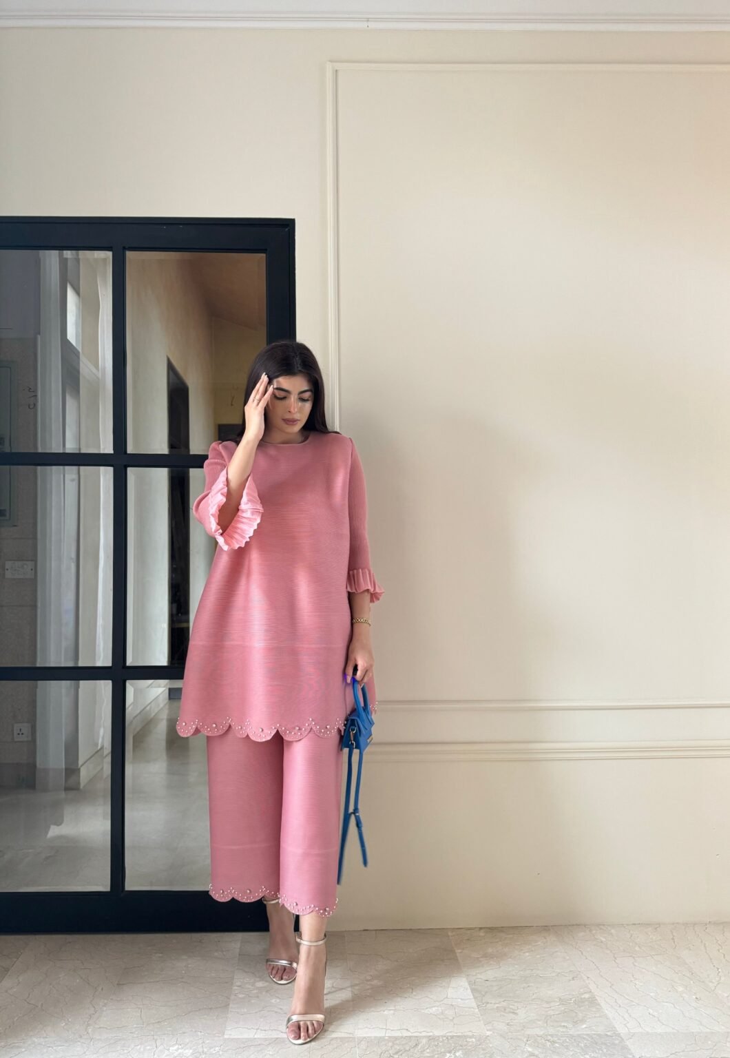 Disclaimer: We try our best to ensure that the colours viewed on the website are an exact representation of the actual colour of the outfit. However, there may be minor variations due to a number of factors such as the nature of fabric dyes, weather at the time of dyeing, and differences in display output due to lighting, digital photography, colour settings, and monitor capabilities. Variations may occur in the fabric pattern, laces, patchwork, and handmade detailing compared to the original sample.Elevate your style with this stunning studded co ord set, crafted from premium pleated rayon and featuring intricate embellishments on hem and pants. With a delicate frill detailing on the sleeves. Making it a perfect choice for evening events.