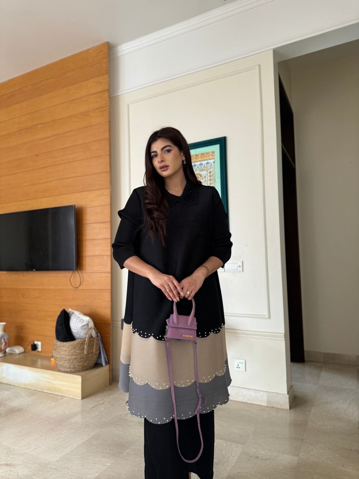 A black dress in premium pleated rayon, featuring tiered layers and embellishments for a glamorous touch. This timeless design is perfect for evening gatherings or night events. Complete the look with our raw silk pants, available separately.